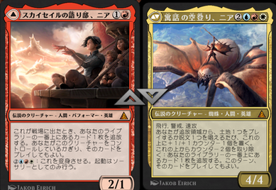序盤は先攻だと「スカイセルの語り部、ニア(グウェン・ステイシー)」や「力戦の紡ぎ手(蜘蛛の顕現)」で戦場を固めます。できればマナクリーチャーである「力戦の紡ぎ手(蜘蛛の顕現)」を出したいところ。でも「スカイセルの語り部、ニア(グウェン・ステイシー)」衝動ドローができるので問題なしです。